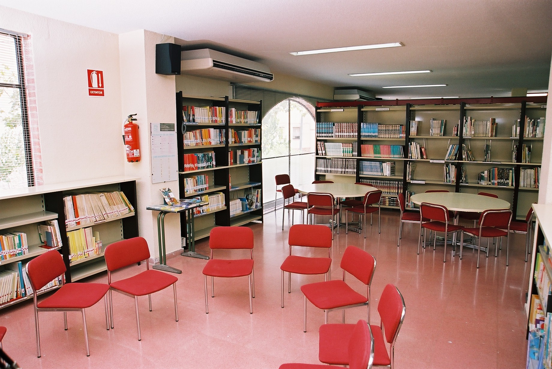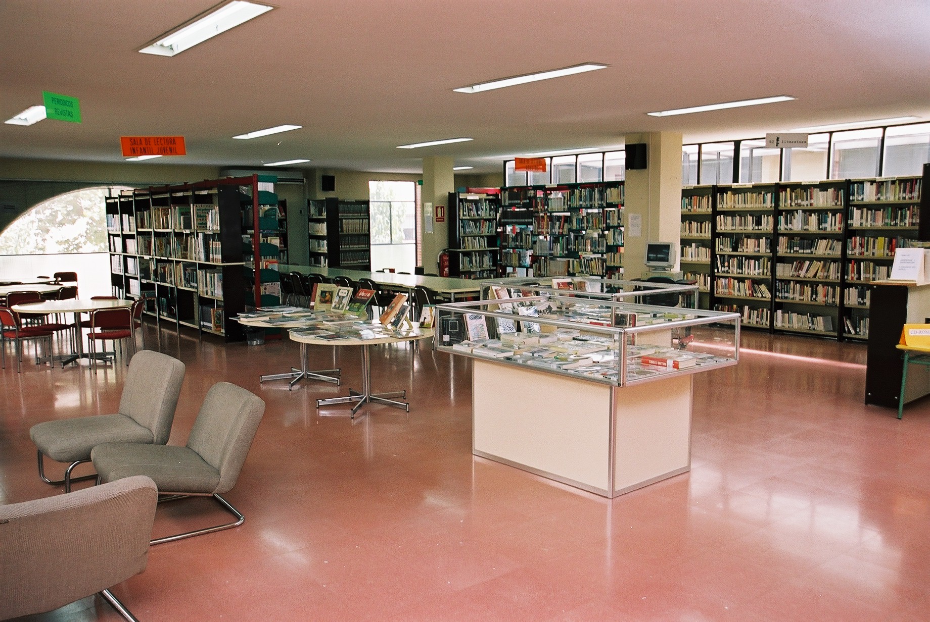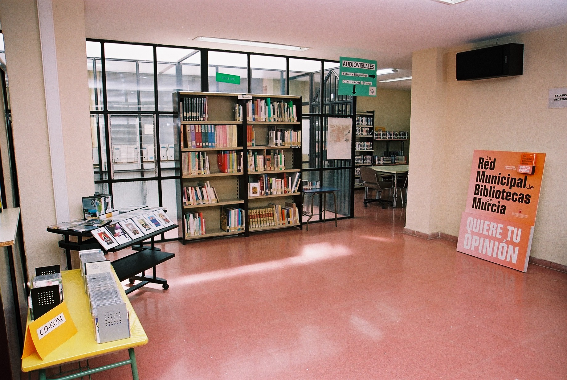 Vista general de la sala. Expositores de novedades en el centro y Sección Juvenil y de Adultos a la derecha (Fotos Carrión [Alcantarilla], 21-7-2003)