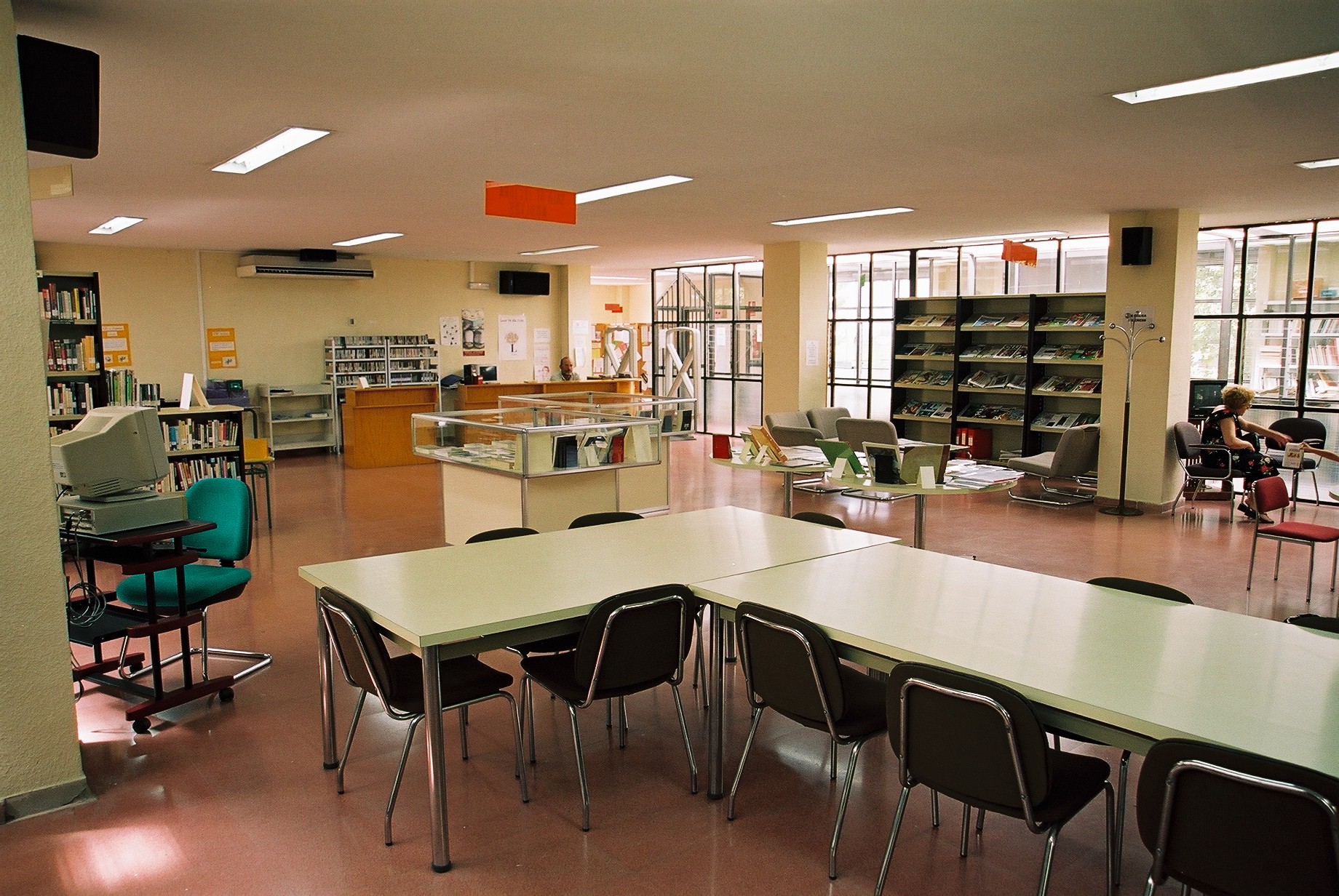 Vista general desde la Sección Juvenil y Adultos. OPAC a la izquierda y mostrador de Recepción, Información y Préstamo, al fondo. A la derecha aparece la Sección de Publicaciones Periódicas (Fotos Carrión [Alcantarilla], 21-7-2003)
