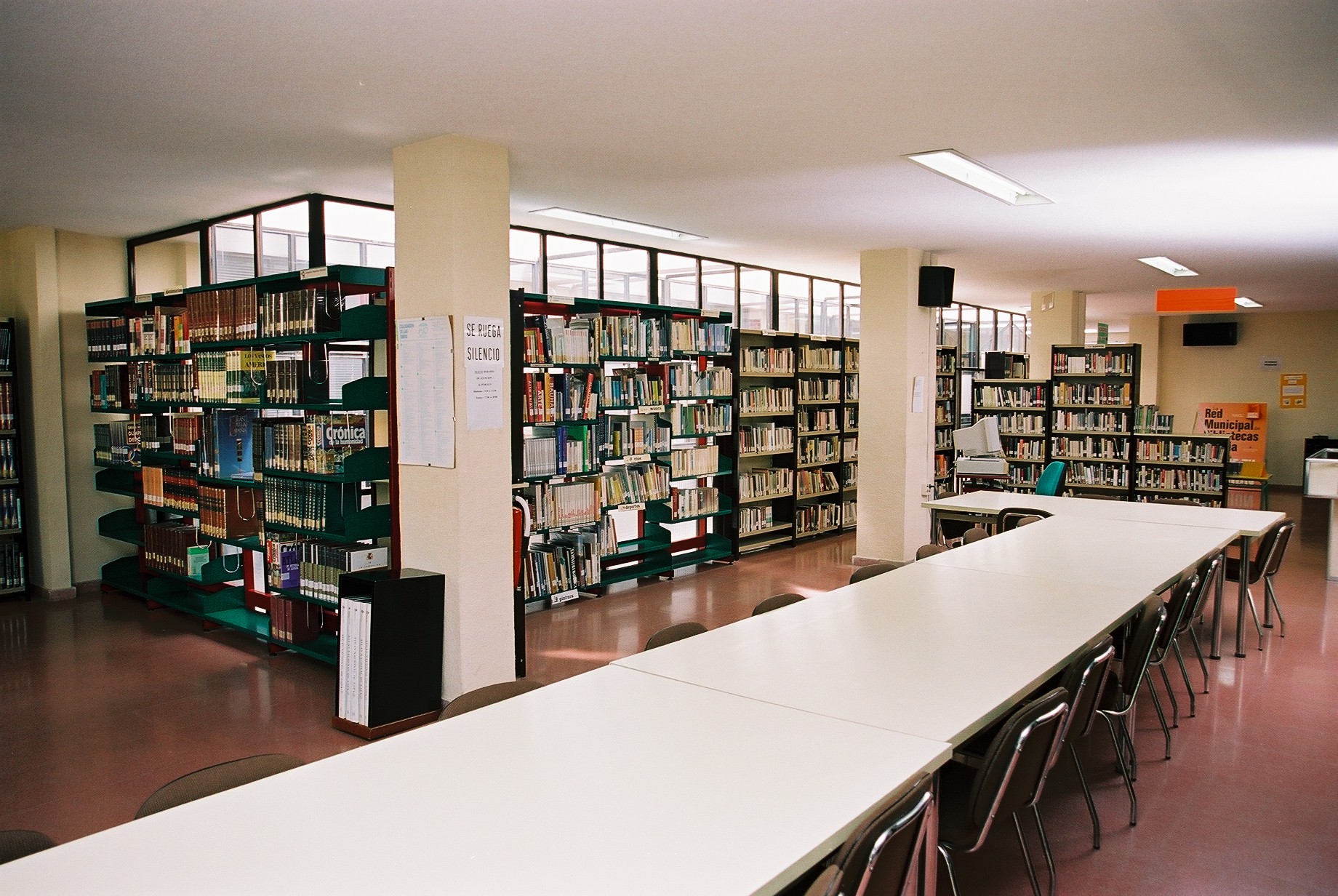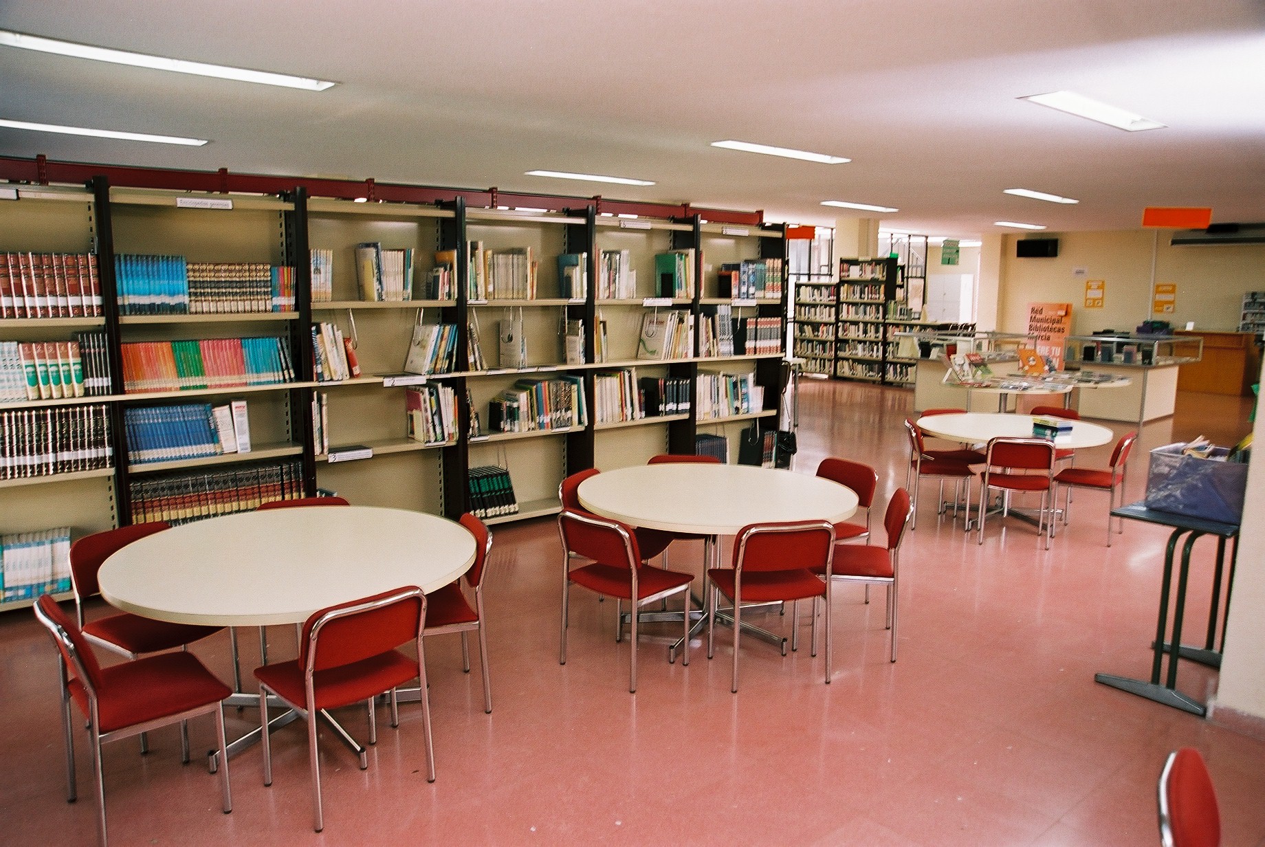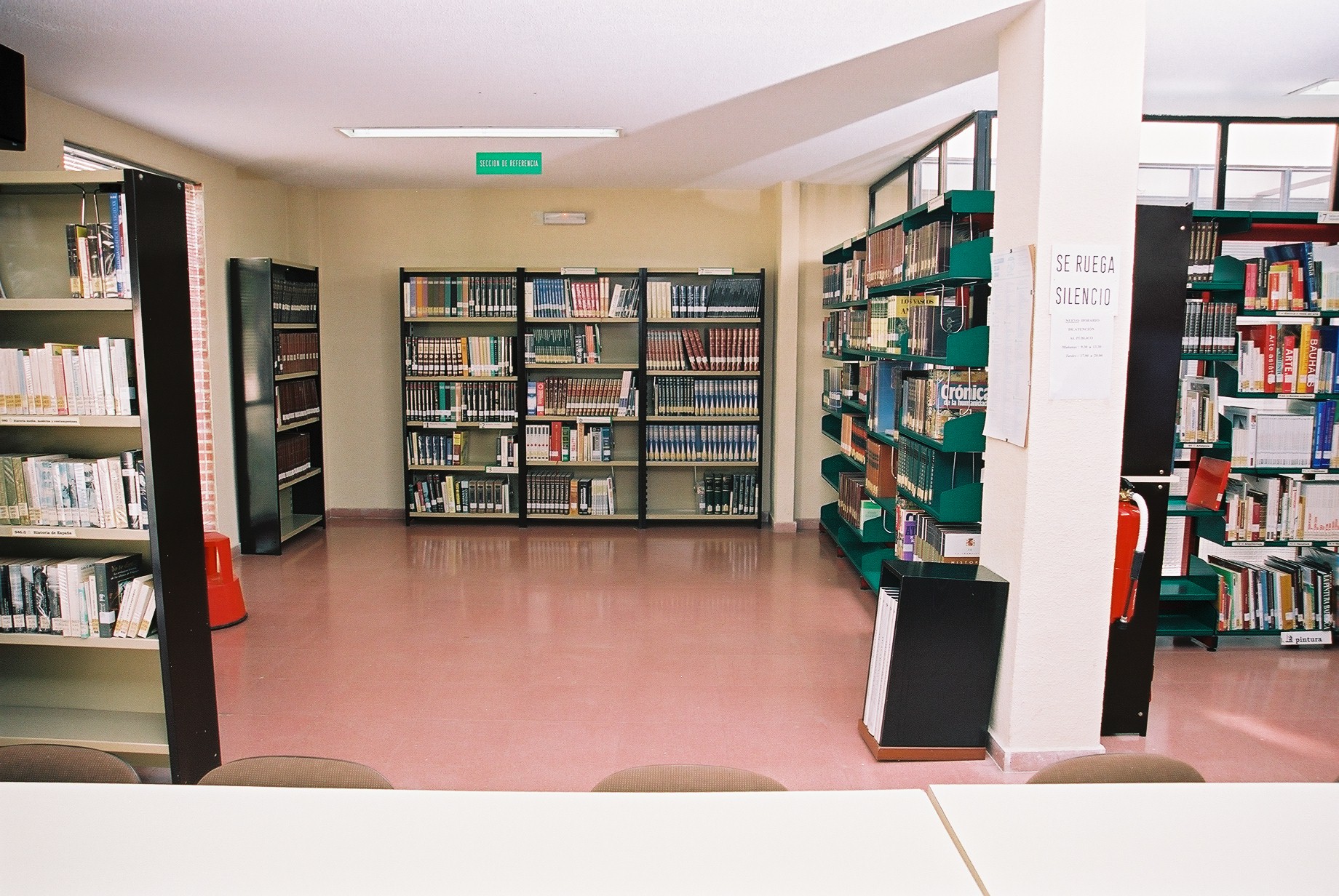 Sección Juvenil y de Adultos con vista parcial de la Sección de Referencia y OPAC a la izquierda (Fotos Carrión [Alcantarilla], 21-7-2003)
