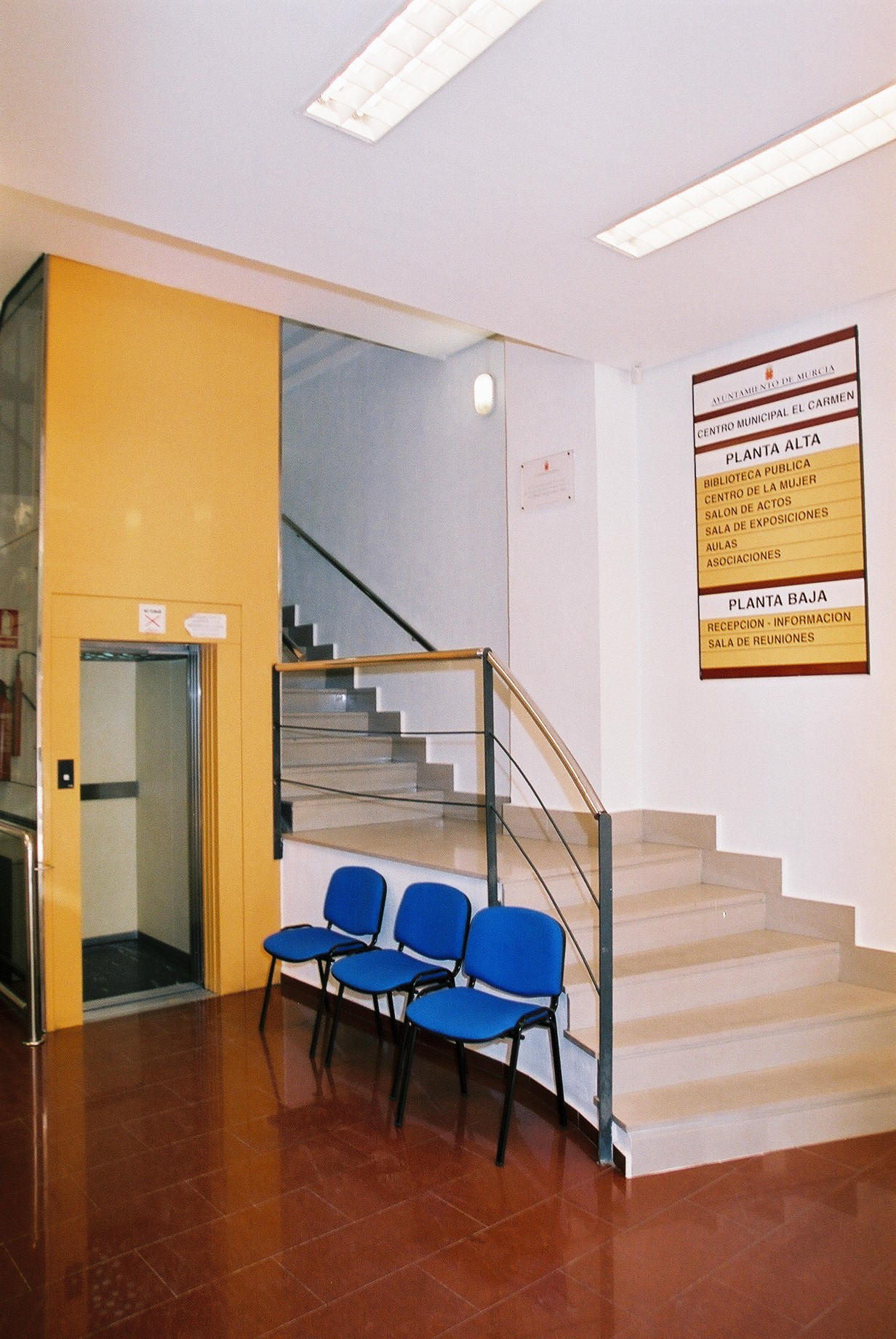 Entrada al Centro Cultural. Ascensor y escaleras de acceso a la 1.ª planta. A la izquierda (no visible) queda el mostrador de información y varias dependencias municipales (Alcaldía de Barrio, Oficina de Información Municipal, etc.) (Fotos Carrión [Alcantarilla], 21-7-2003)