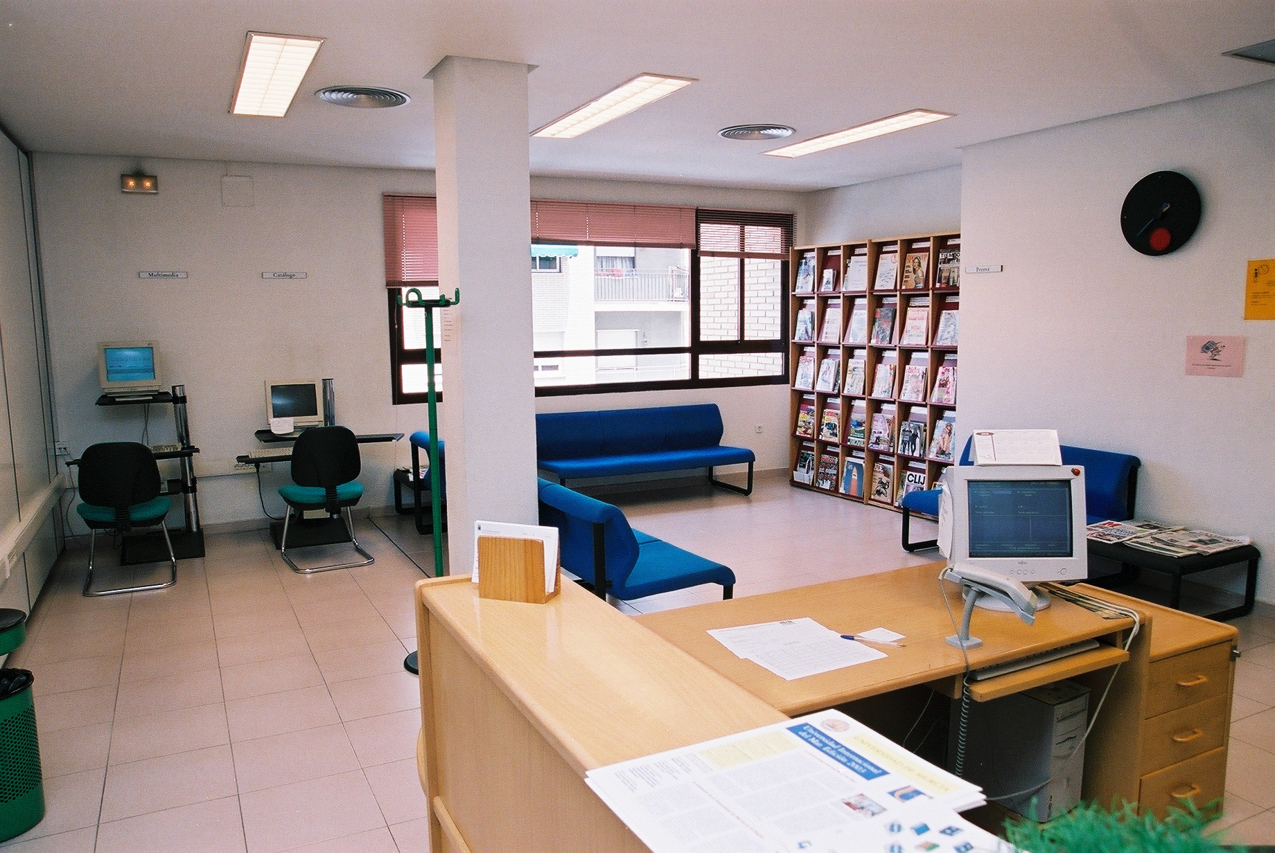Acceso a la Sección Infantil, puesto de control/trabajo y zona para exposición de novedades, audiovisuales y revistas infantiles (Fotos Carrión [Alcantarilla], 21-7-2003)