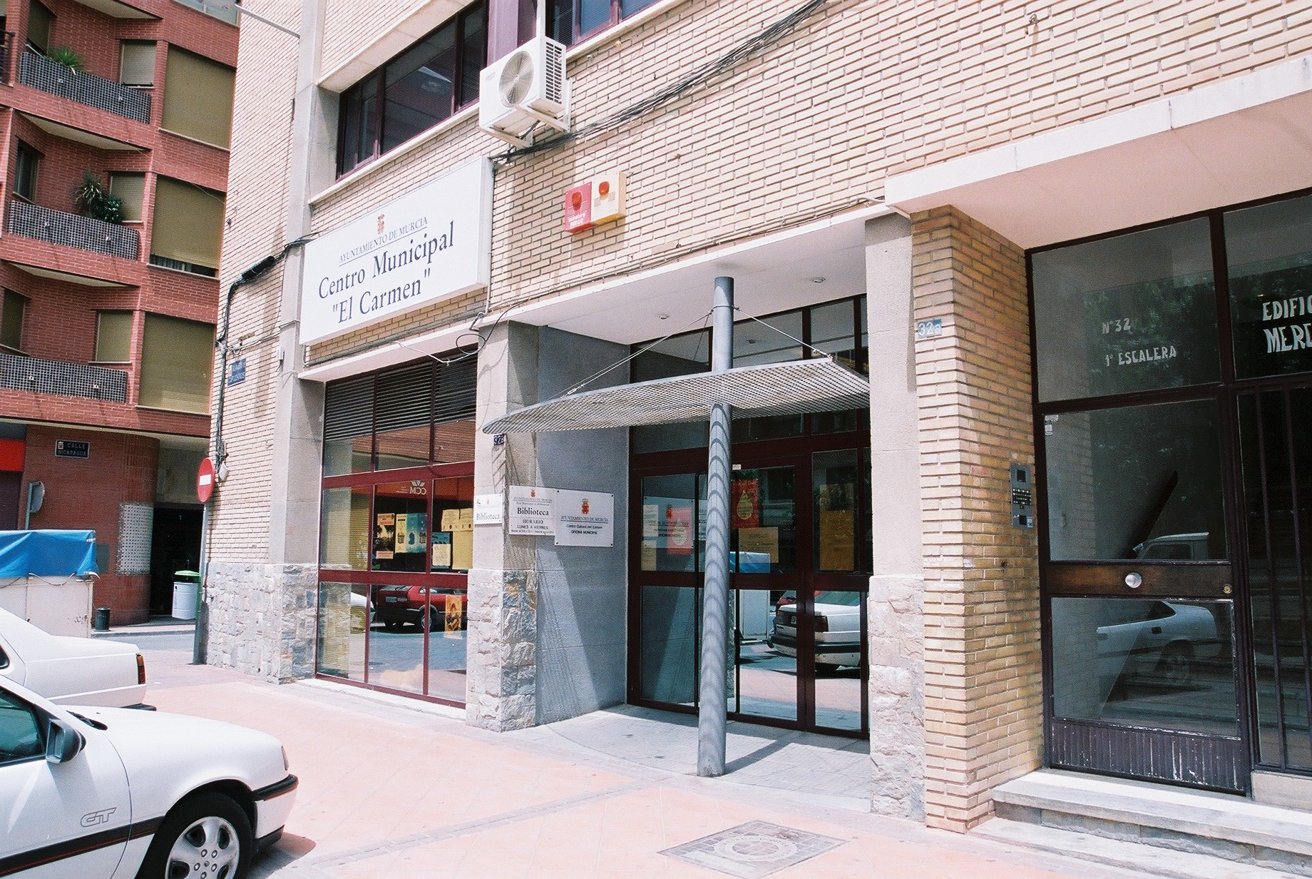 Fachada principal del edificio donde está ubicado el Centro Cultural "El Carmen" y la Biblioteca. Ambos comparten acceso desde el exterior (Fotos Carrión [Alcantarilla], 21-7-2003)