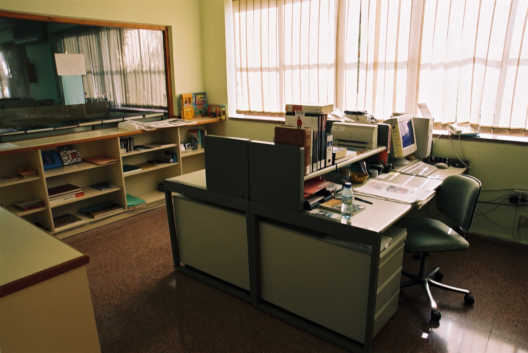 Vista del despacho desde la puerta de entrada a él. Además de despacho es también la zona de Proceso Técnico (Fotos Carrión [Alcantarilla], 21-7-2003), 594 KB