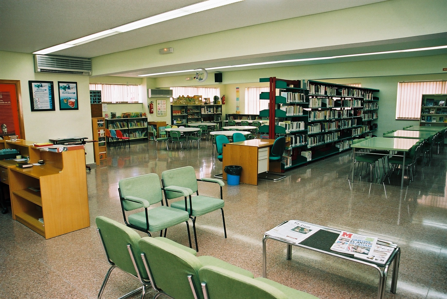 Vista general desde la Sección de Diarios & Revistas: de izquierda a derecha, Recepción, Información y Préstamo, Sección Infantil y Sección Juvenil y de Adultos (Fotos Carrión [Alcantarilla], 21-7-2003), 828 KB