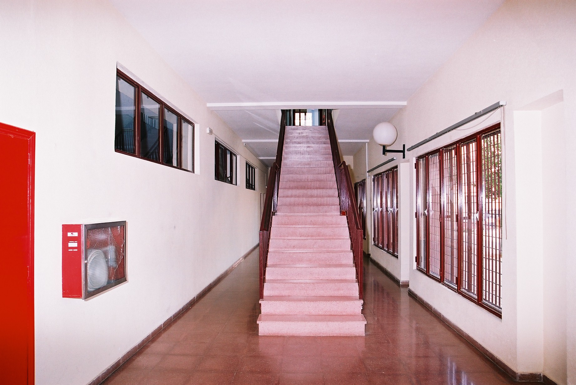 Escalera de acceso a la planta superior del edificio, donde se encuentran ubicados los servicios bibliotecarios (Fotos Carrión [Alcantarilla], 21-7-2003)