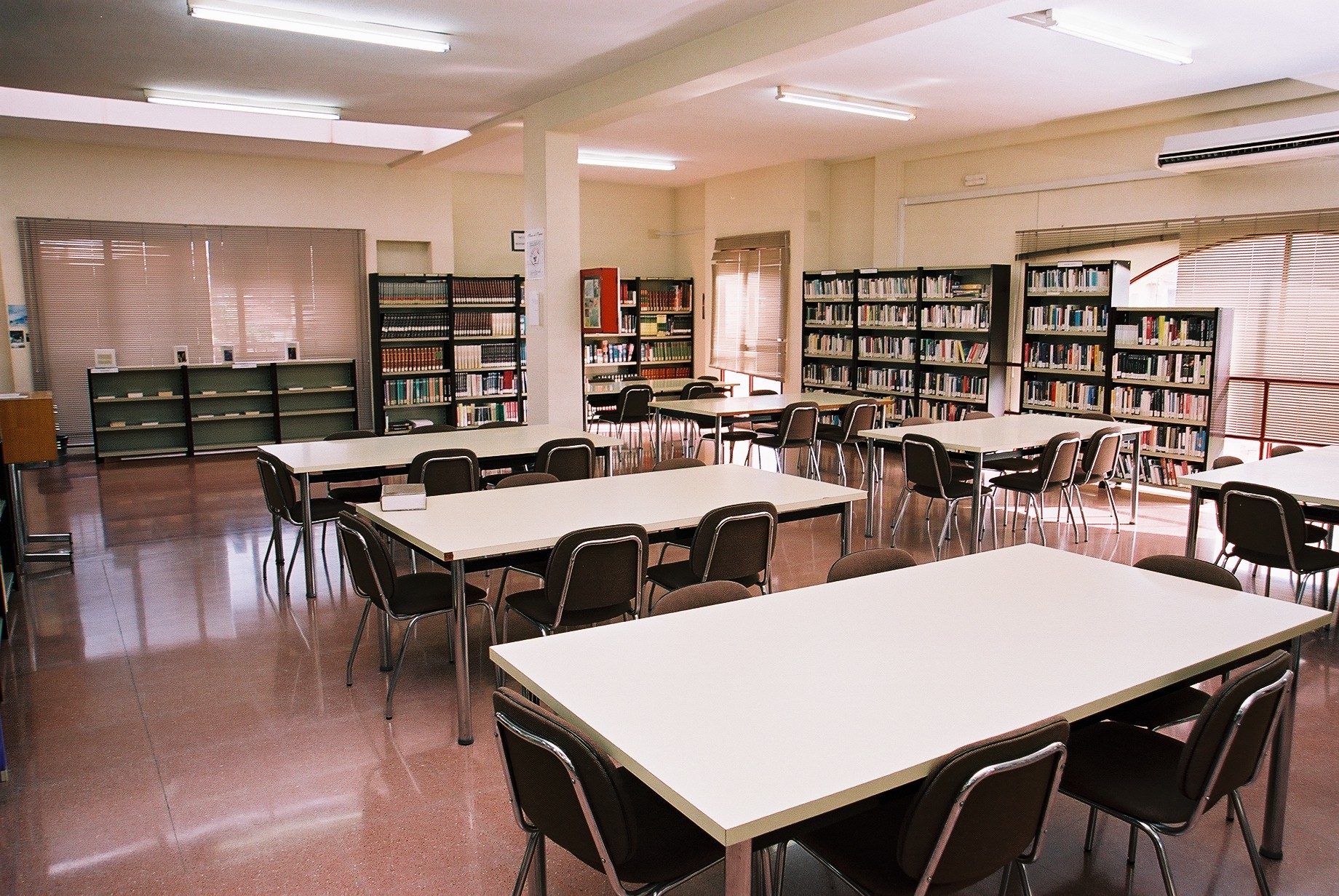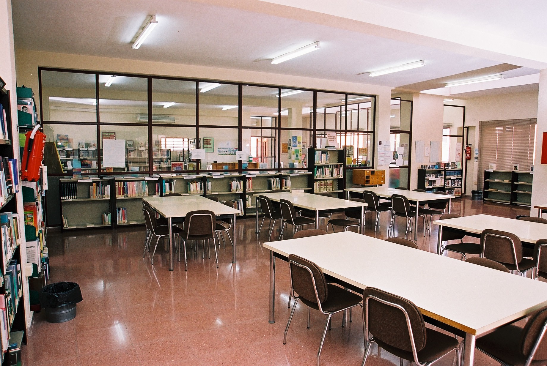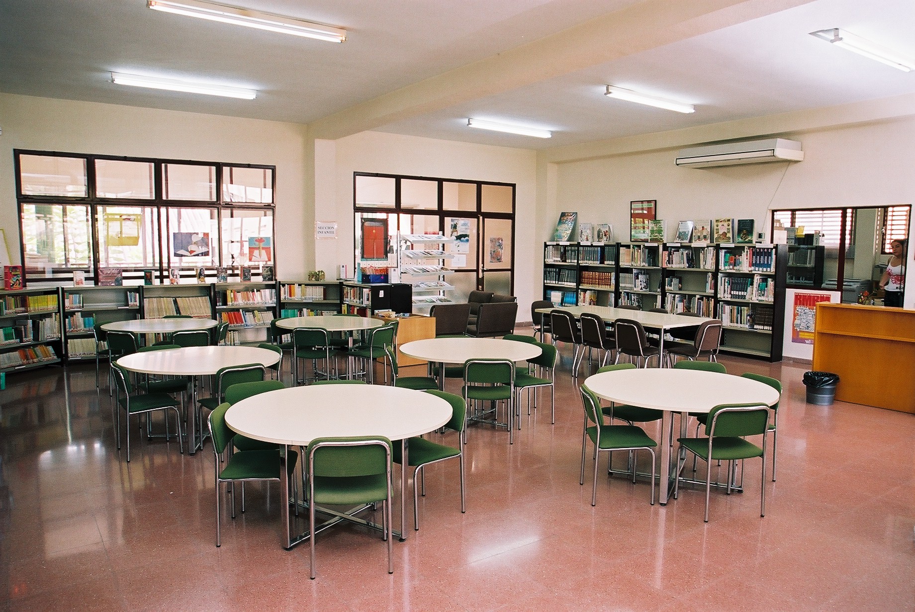 Sala Juvenil y de Adultos con las estanterías de Novedades, y la Sección de Referencia a continuación. Vista global de ambas salas, con la puerta de acceso a la derecha y Despacho-Depósito al fondo (Fotos Carrión [Alcantarilla], 21-7-2003)