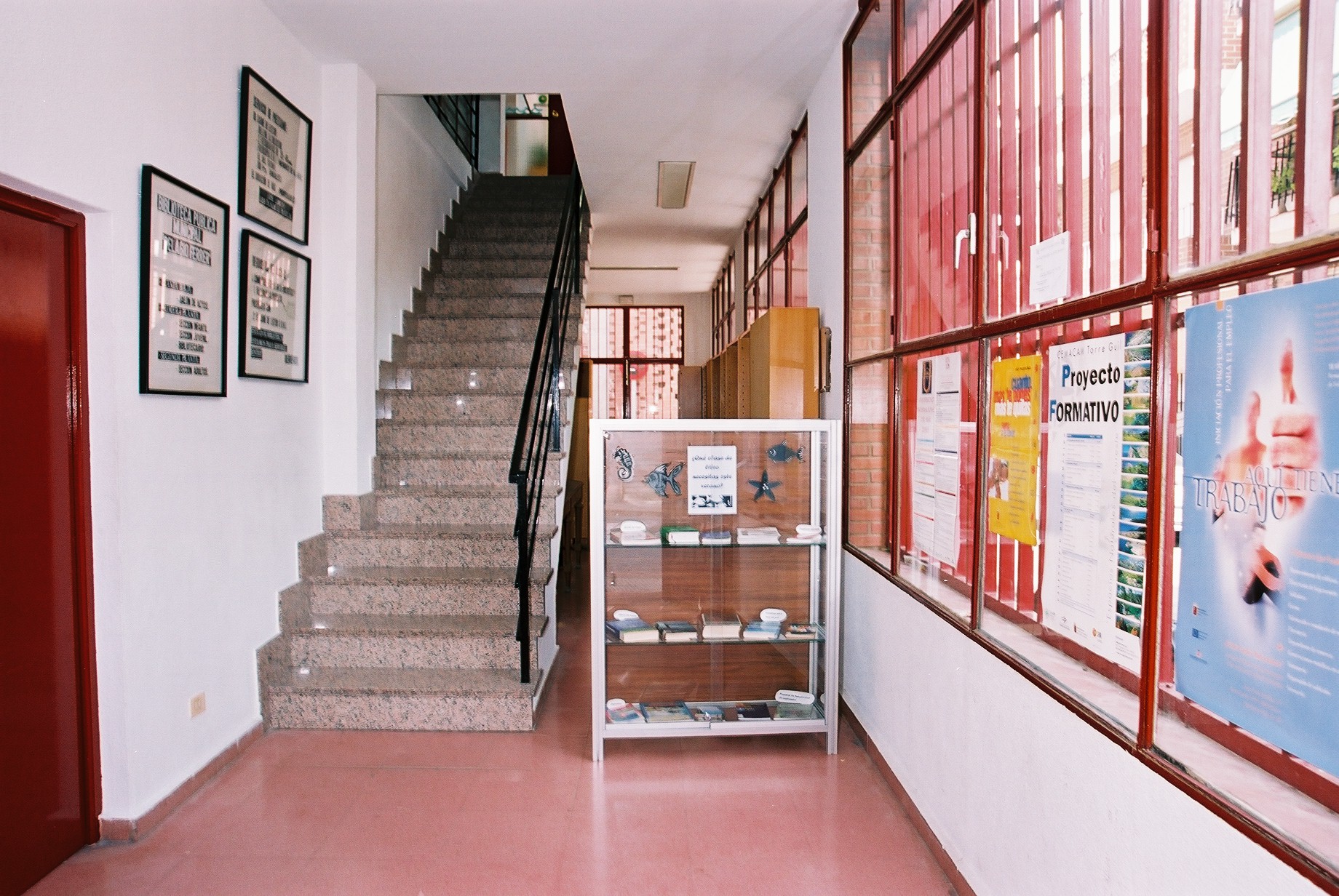 Planta baja, con escalera de acceso a las plantas superiores, puerta del Salón de Actos a la izquierda y expositor al fondo (Fotos Carrión [Alcantarilla], 21-7-2003)