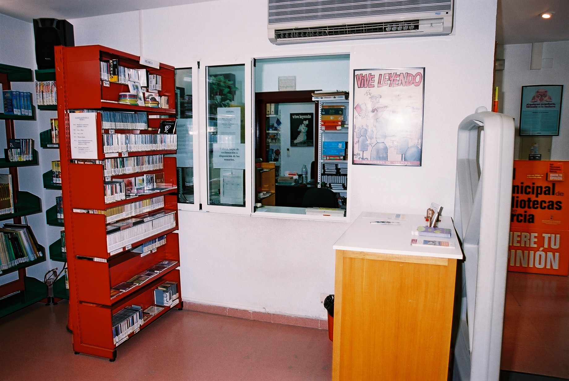 1.ª planta. Expositor de discos y ventana de Préstamo con despacho al fondo. A la derecha acceso a la sala (Fotos Carrión [Alcantarilla], 21-7-2003)