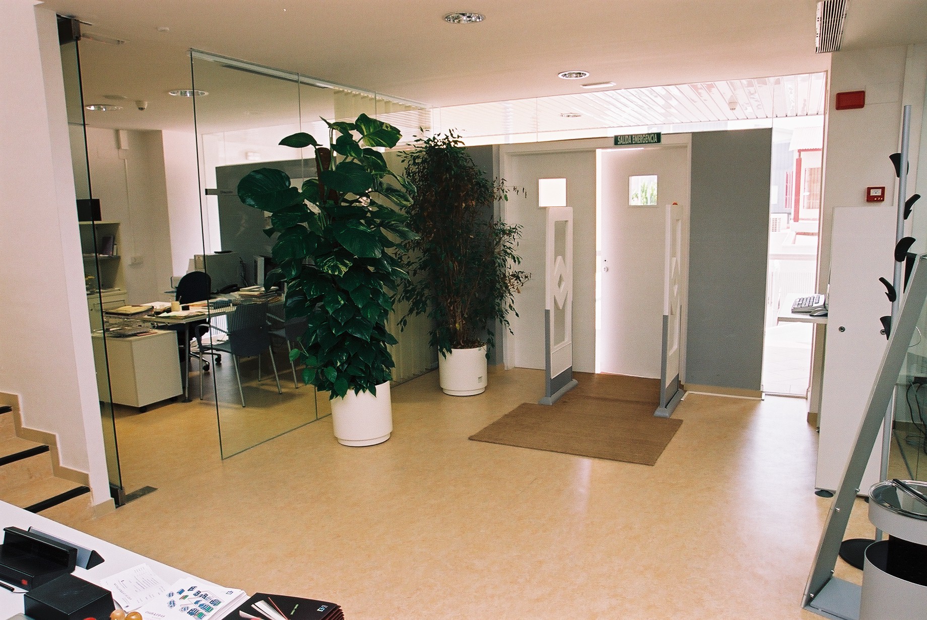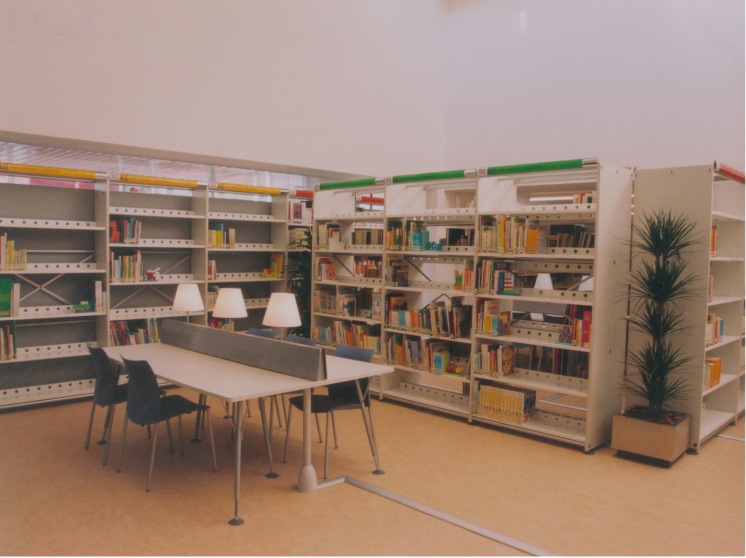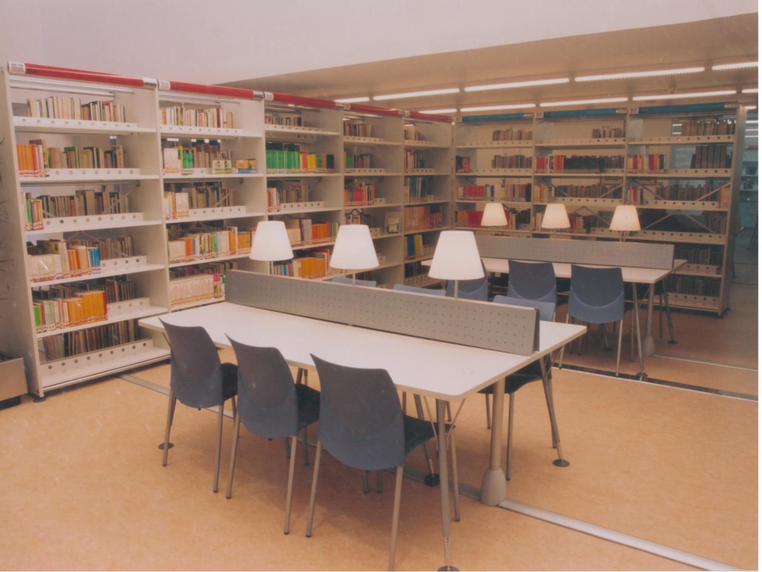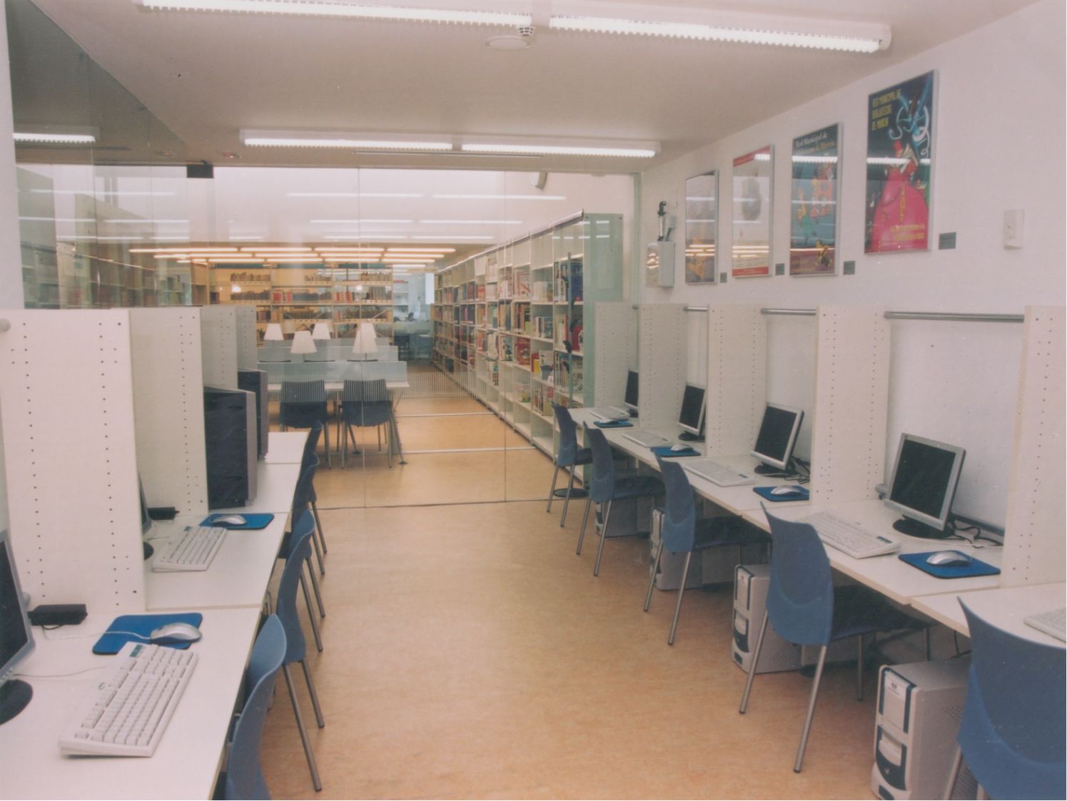 Entrada a la Biblioteca desde el interior, desde el mostrador de Recepción, Información y Préstamo (Fotos Carrión [Alcantarilla], 21-7-2003)