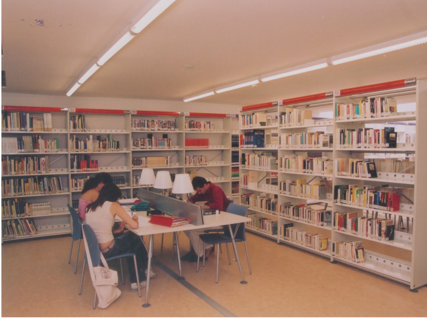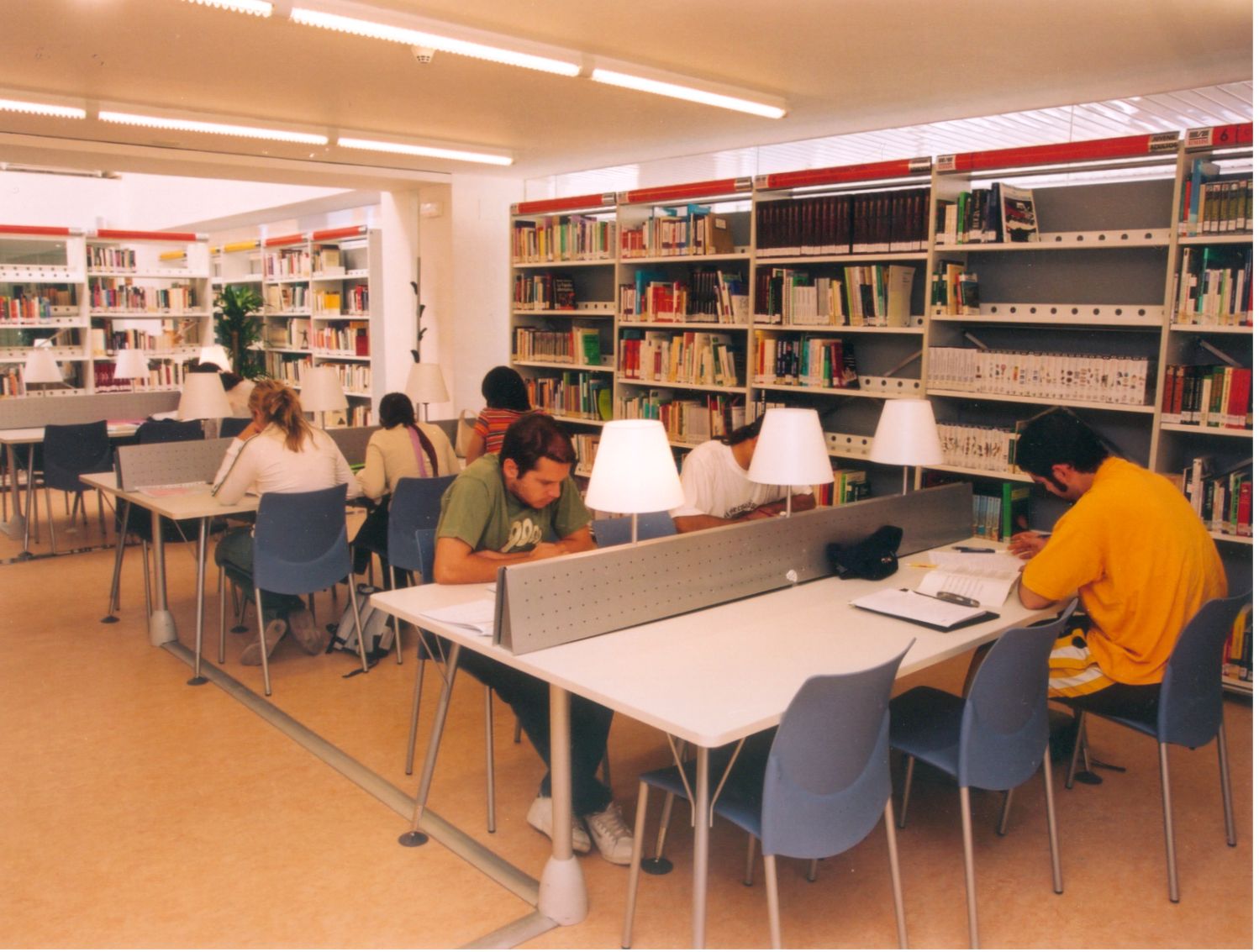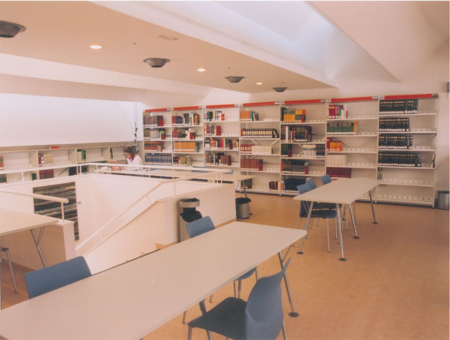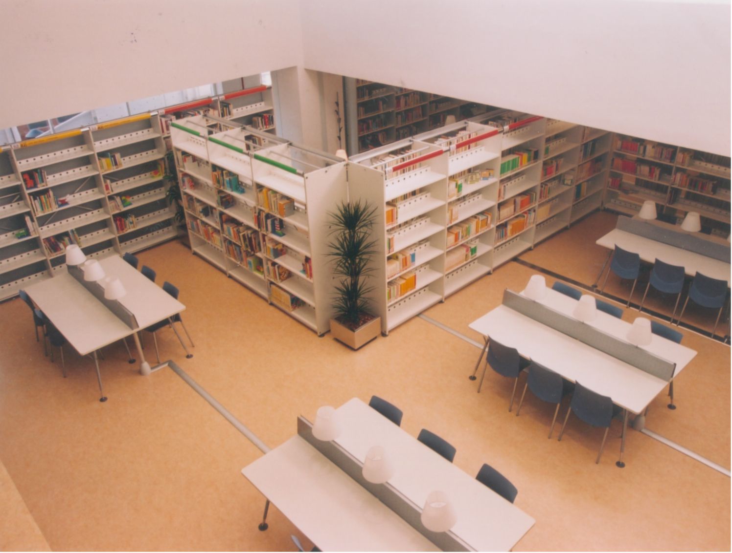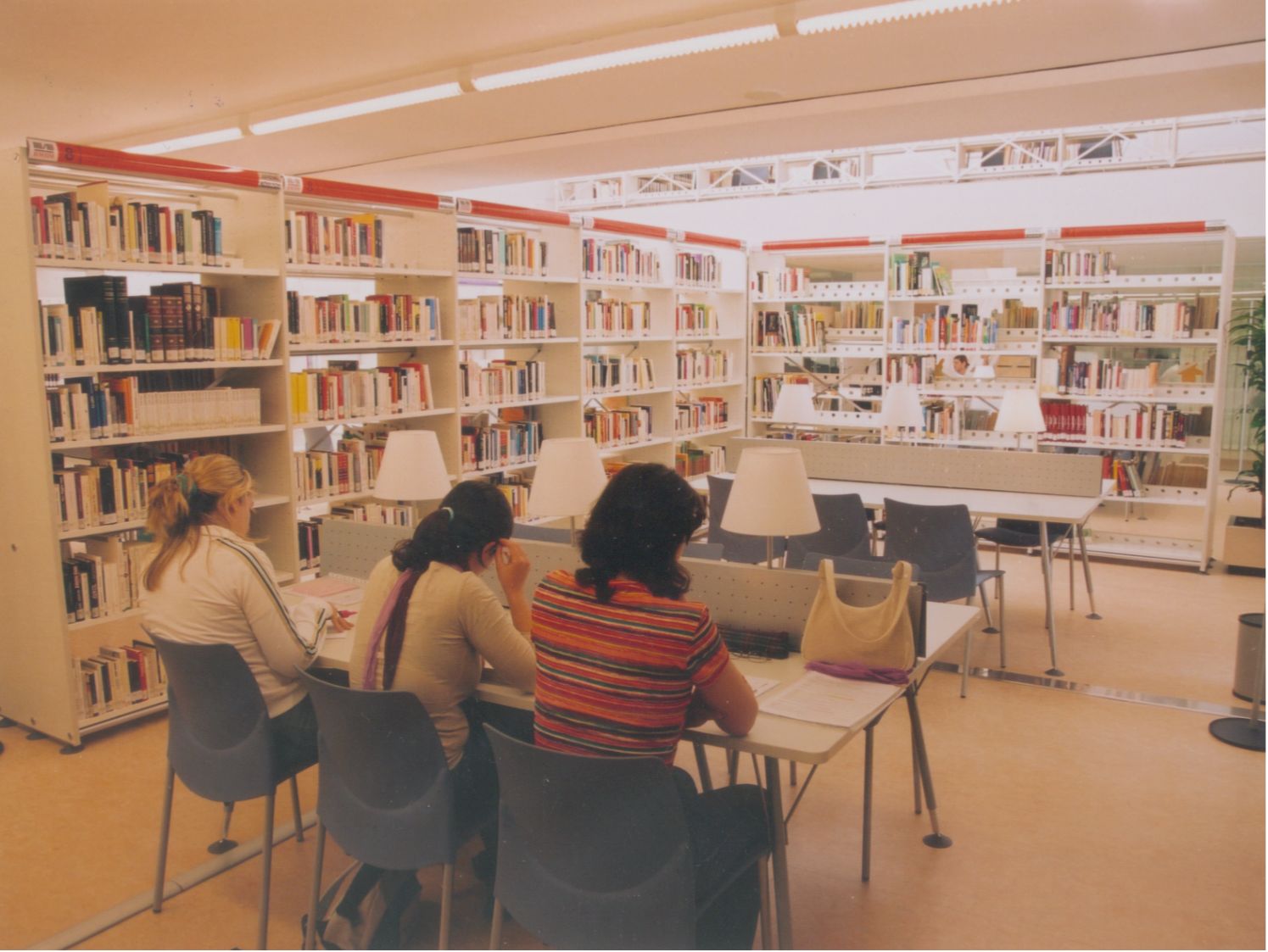 Entrada a la Biblioteca desde el interior, desde el mostrador de Recepción, Información y Préstamo (Fotos Carrión [Alcantarilla], 21-7-2003)
