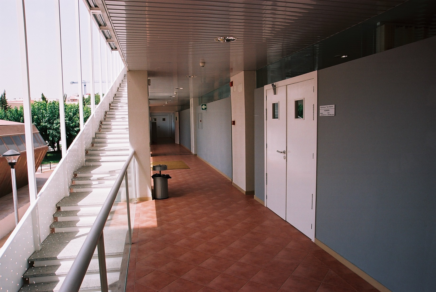 Puerta de entrada a la Biblioteca y vista del corredor de acceso por la escalera (Fotos Carrión [Alcantarilla], 21-7-2003)