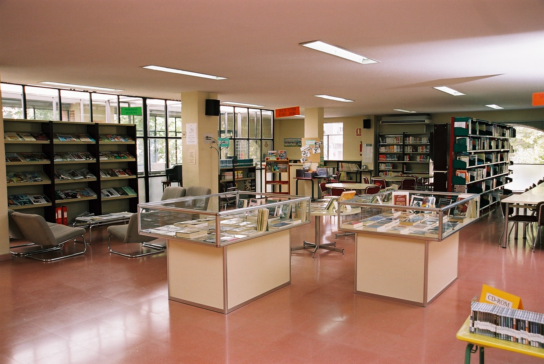 Vista general de la sala. Expositores de novedades en el centro y Sección Juvenil y de Adultos a la derecha (Fotos Carrión [Alcantarilla], 21-7-2003)