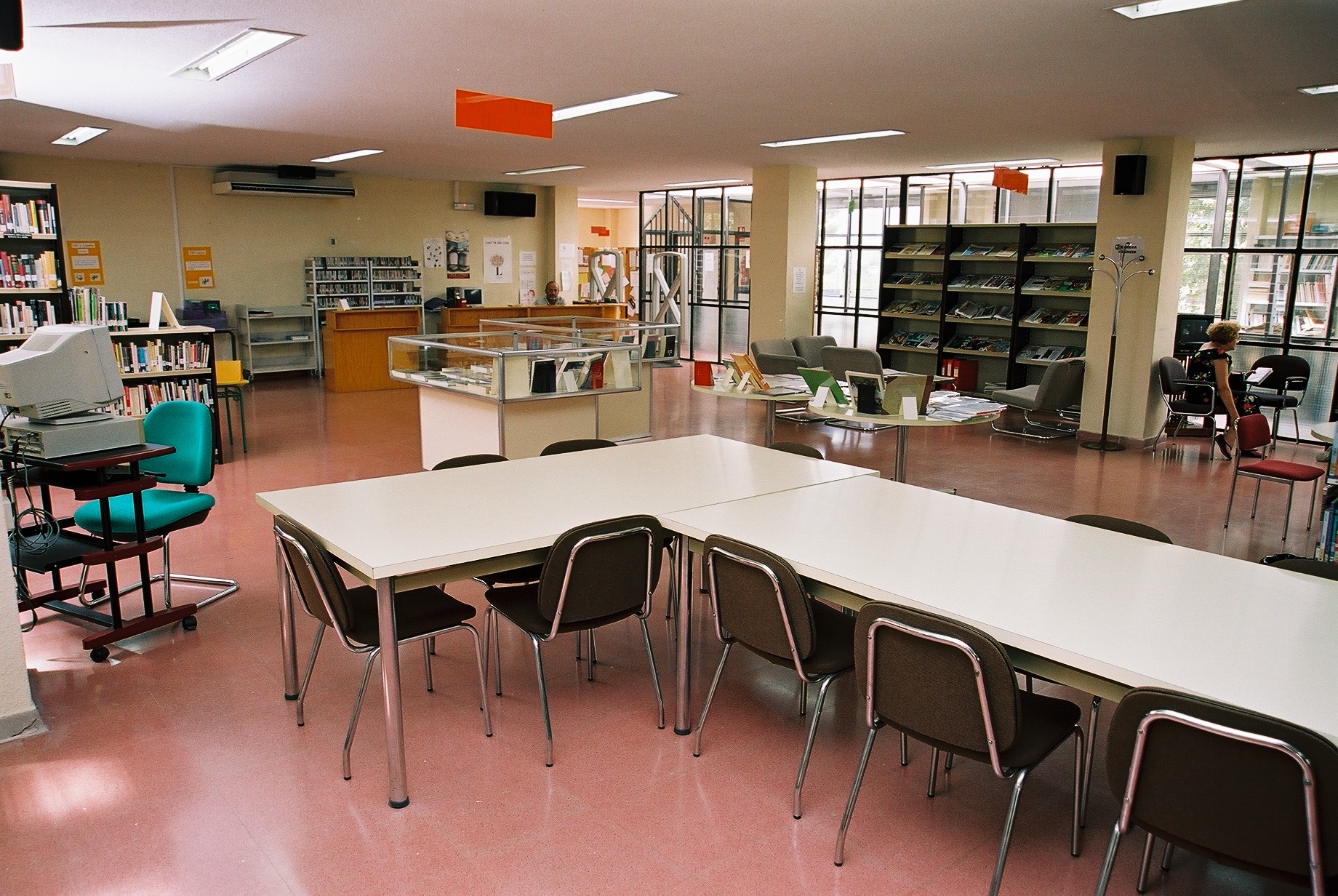 Sección Juvenil y de Adultos con vista parcial de la Sección de Referencia y OPAC a la izquierda (Fotos Carrión [Alcantarilla], 21-7-2003)