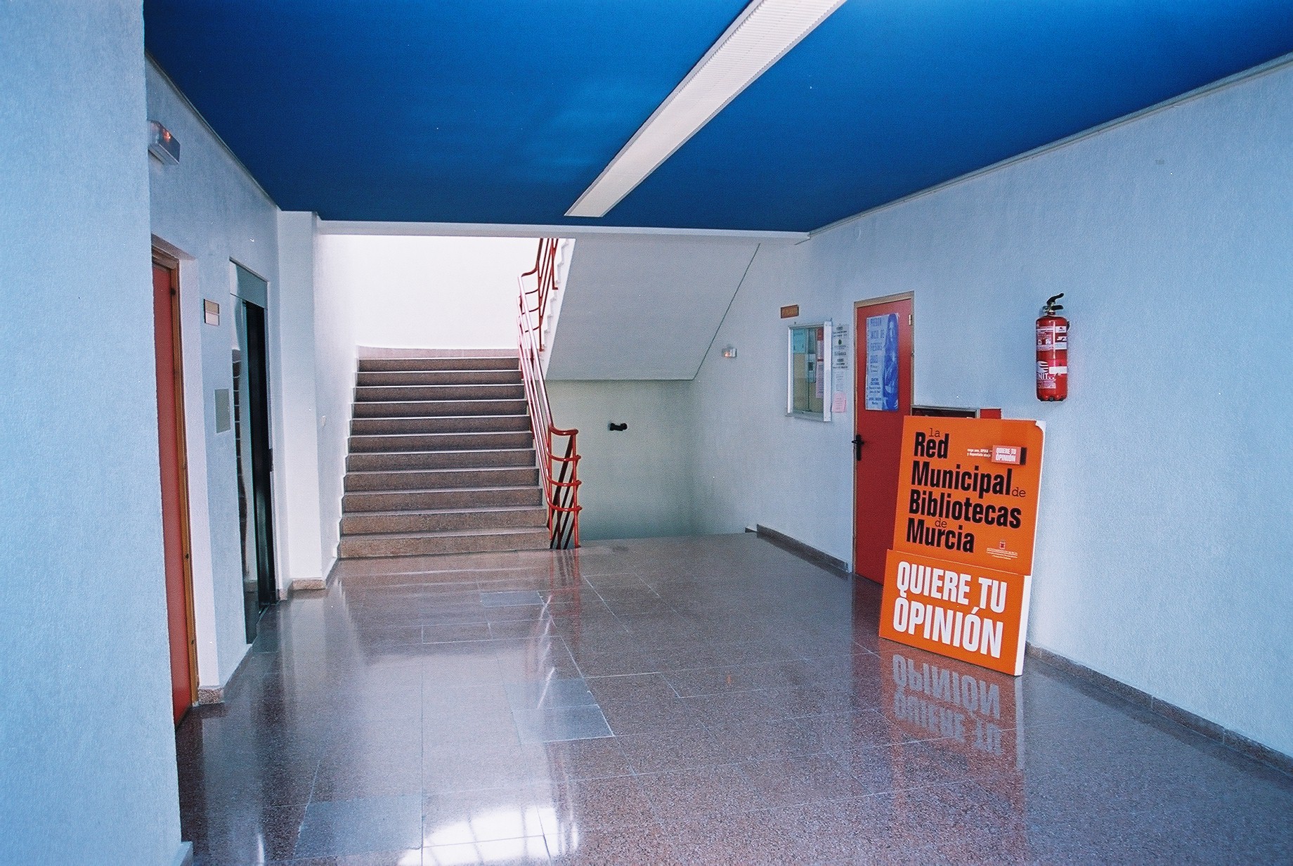 Entrada, en la primera planta, con imagen del contenedor y buzón de las Hojas de Sugerencias (Fotos Carrión [Alcantarilla], 21-7-2003), 727 KB