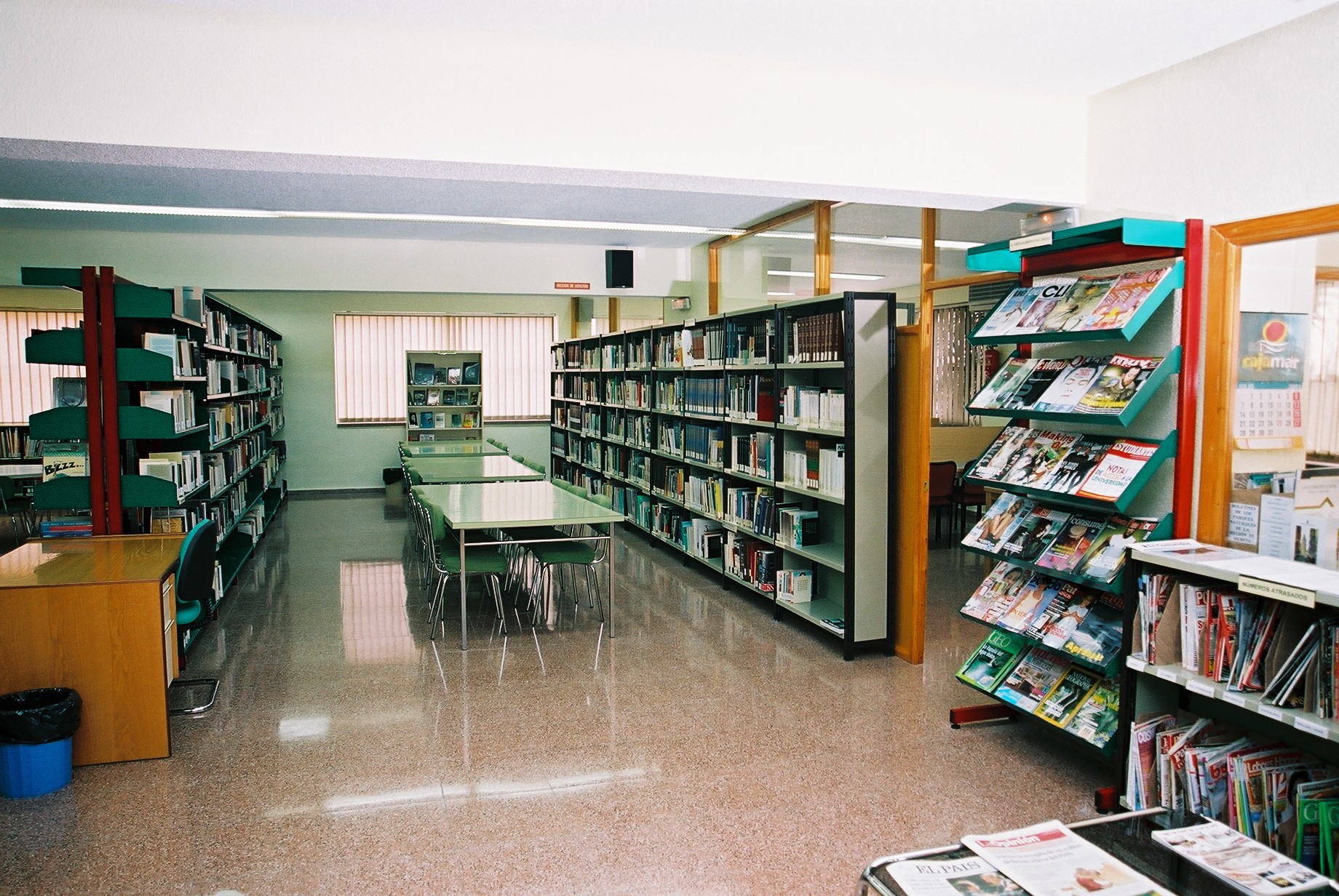 Vista general desde la Sección de Diarios & Revistas: de izquierda a derecha, Recepción, Información y Préstamo, Sección Infantil y Sección Juvenil y de Adultos (Fotos Carrión [Alcantarilla], 21-7-2003), 828 KB
