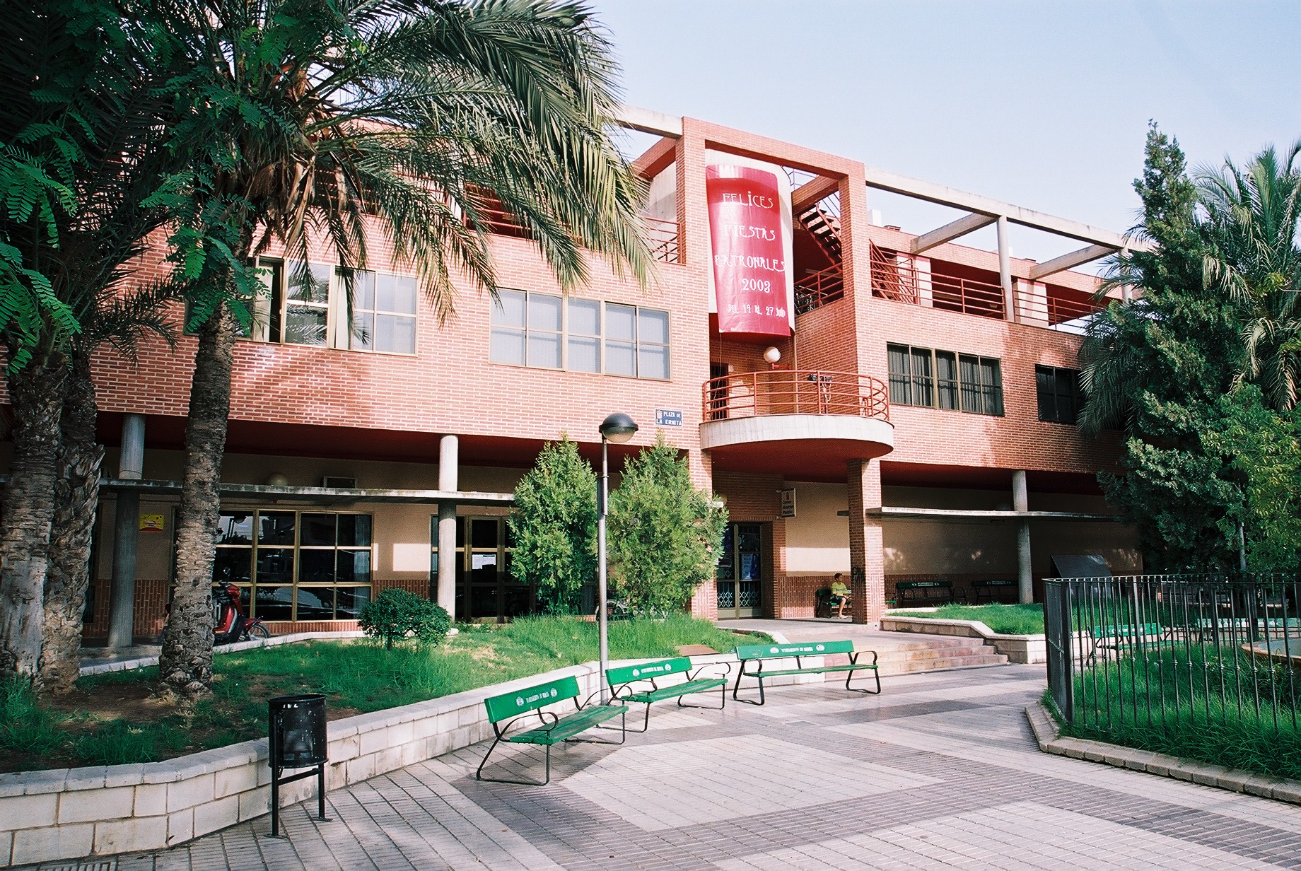 Fachada de Centro Cultural vista desde su lado izquierdo. Las ventanas a la derecha del balcón son las de la Biblioteca (Fotos Carrión [Alcantarilla], 21-7-2003), 993 KB