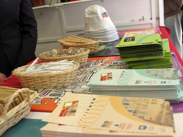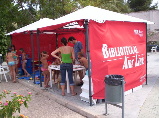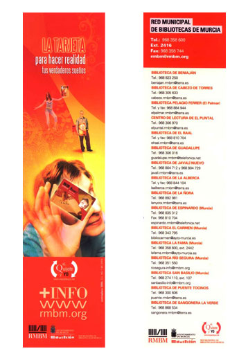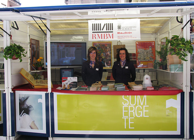 Comentarios: Caseta informativa y promocional ubicada en la Avenida Alfonso X el Sabio de Murcia con motivo de la celebración de la XXI Feria Regional del Libro. Atendida por bibliotecarias-azafatas, la caseta contaba con una TV de plasma en la que se proyectaba una navegación simulada del web rmbm.org. En el mostrador se exponían diversos folletos y artículos promocionales de la Red Municipal de Bibliotecas de Murcia para repartir entre los visitantes.