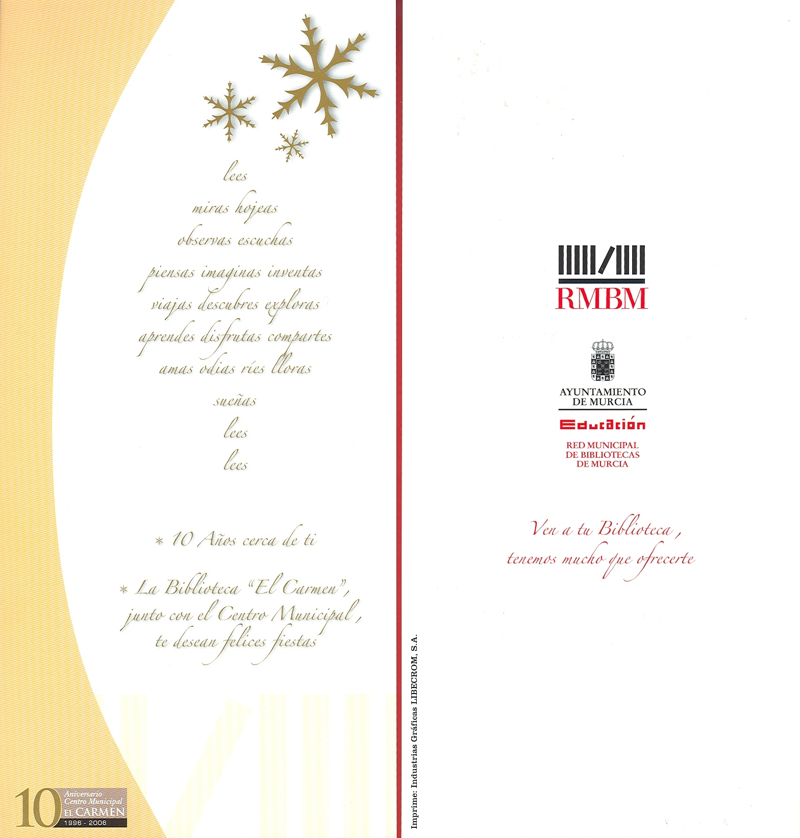 Comentarios: Tarjetón conmemorativo de décimo aniversario de la Biblioteca «El Carmen» (18 de diciembre), enmarcado en el del Centro Municipal homónimo. Impreso sobre papel «Job Arte» semimate de 250 gr.