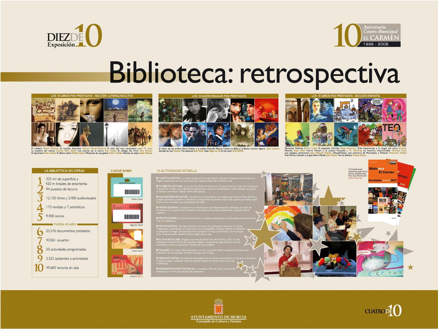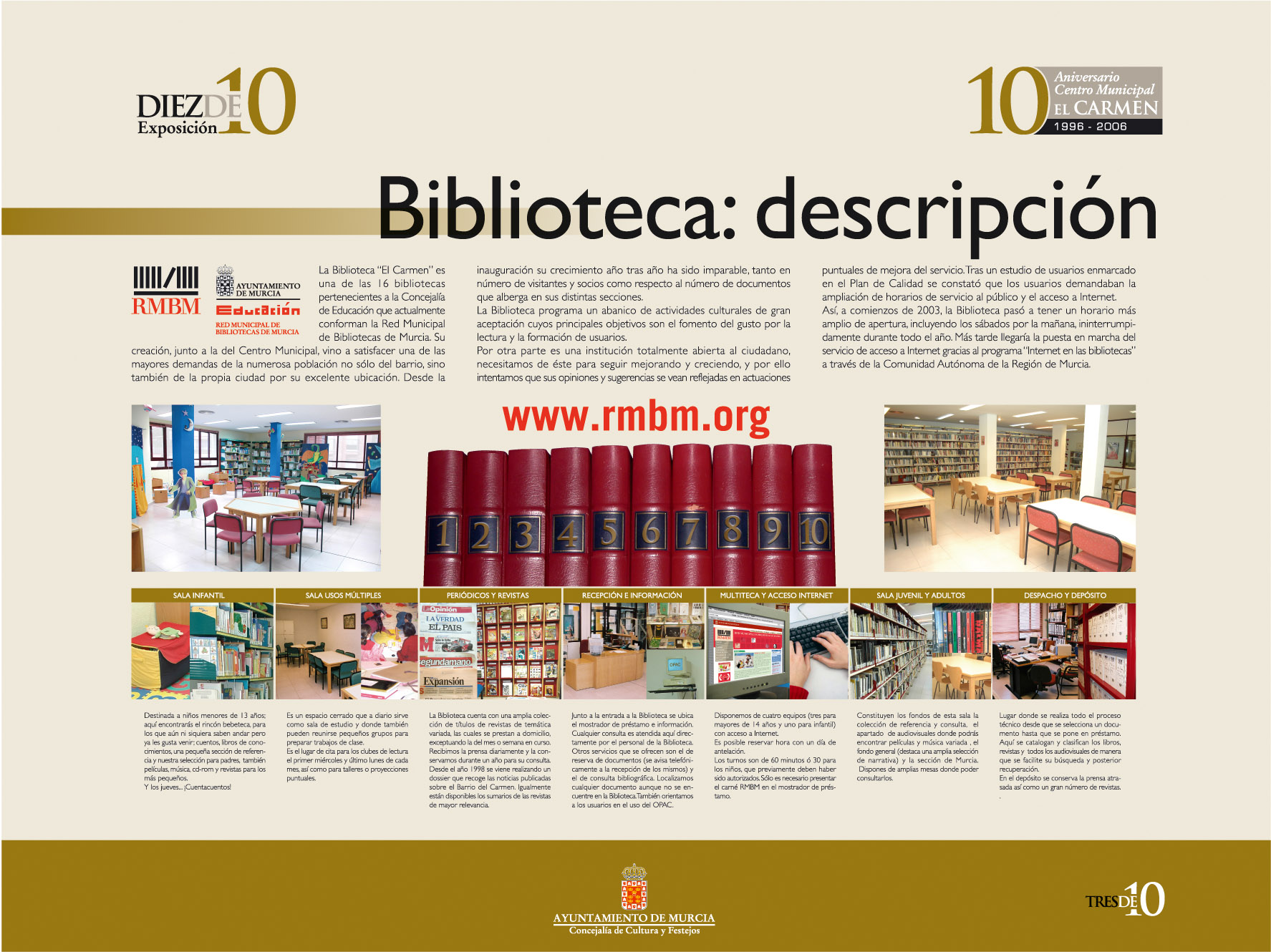 Comentarios: Textos de C. Simón Santamaría y A. Soler Madrid. Paneles 3 y 4 de la exposición montada para celebrar el décimo aniversario del Centro Municipal «El Carmen» y, por tanto, de la Biblioteca (se inauguraron el mismo día). Impreso sobre papel en plotter, laminado mate en caliente, montaje en foam de 10 mm, enmarcado en aluminio
