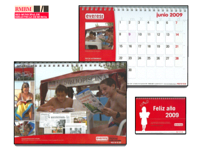 Comentarios: Calendario publicitario de sobremesa con páginas unidas por gusanillo de alambre en el que el Grupo Everest muestra fotografías de sus productos y proyectos. Incluye dos hojas con «gomets» adhesivos para marcar las citas con «Everest», las «comidas y cenas», las «vacaciones», los «viajes», etc. Junio lo ocupa una imagen de la bibliopiscina de Corvera (corresponde a la campaña del año 2006).