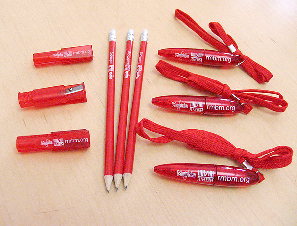 Descripción física: 1 bolígrafo con cinta para colgar al cuello: plástico, rojo ; 9 cm.; 1 lápiz: madera (color rojo) con goma de borrar; 1 sacapuntas para incorporar de caperuza a un lápiz: rojo: 6 x 1,5 x 1,5 cm (largo, alto y ancho)