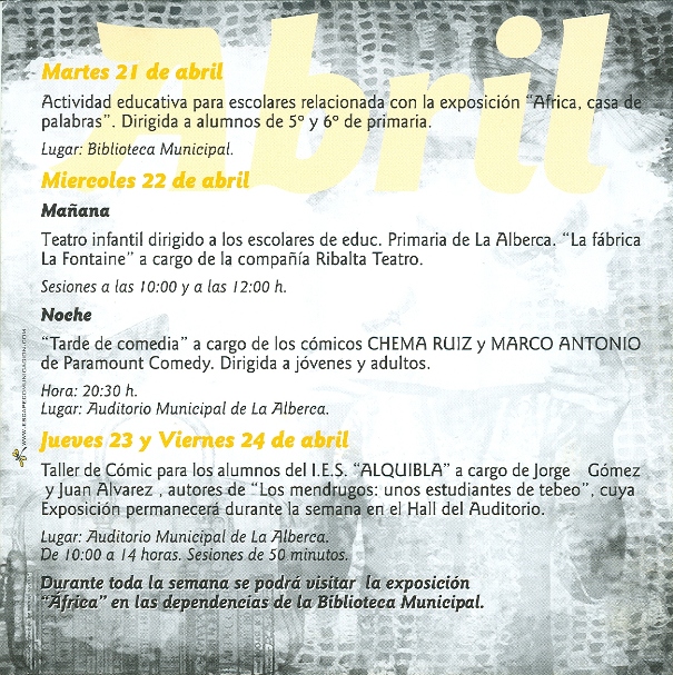 Comentario: actividades organizadas por la Biblioteca de La Alberca y el Centro Cultural, con la colaboración de la Junta Municipal y de la Biblioteca Regional. Haciendo clic en la imagen puedes ver el anverso del tarjetón. Reverso.